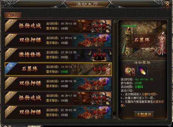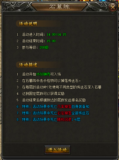 活动会在每天14:00-14:15开启进入,超过进入时间则无法进入。而石墓会在15:00时关闭。